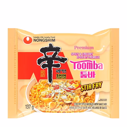 Nongshim Shin Toomba Spicy & Creamy Stir-Fry Ramyun är en rik och fyllig nudel med en unik kombination av het och krämig smak som erbjuder en god och exklusiv upplevelse. Välkomponerade smaker tillsammans med ett härligt tuggmotstånd i nudlarna samt goda grönsaker gör nudelpaketet till en lyxig måltid. Nongshim Shin Ramyuns karaktäristiska hetta blandas med krämig stir fry. Rätten är inspirerad av ett recept som skapat internetsuccé, där Nongshims nudlar och heta kryddor blandats med smält ost, stekt vitlök samt andra goda tillbehör, och har uppmuntrat Nongshim att skapa denna variant. En av favoriterna som säljer bäst bland Nongshim.